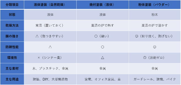 - 使用環境に合わせて手法を選ぶ(仕上がり重視の焼付、強度重視の粉体)